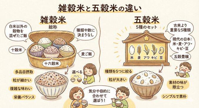 最近の市販品では、以下のような使い分けがされています。- 五穀米: 種類を5つに絞っているため、それぞれの穀物の粒が大きく、素材の味が際立ちます。シンプルで素朴な味わいを好む方向けです。