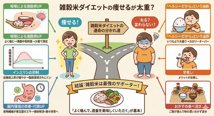 - 代謝サポート: 糖質をエネルギーに変えるには「ビタミンB1」が必要です。白米にはこれがほとんど含まれていませんが、雑穀米には豊富に含まれています。つまり、食べたカロリーを効率よく燃焼できる体作りをサポートしてくれるのです。