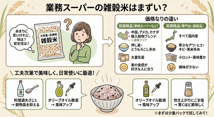 もし「独特の穀物臭が気になる」と感じた場合は、料理酒を大さじ1杯入れて炊く、風味の良いオリーブオイルを数滴垂らす、炊き上がりにごま塩を振るなどの工夫で、驚くほど美味しくなります。まずは少量パックで試してみるのが賢い方法です。