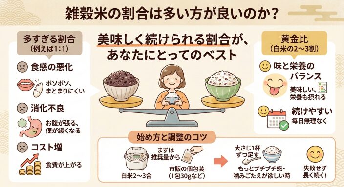初めての方は、白米2合に対して雑穀大さじ1〜2杯(全体の約5〜10%)から始めてみましょう。違和感がなければ徐々に増やし、白米2:雑穀1(約30%)くらいまで増やすと、栄養価も食感も最大限に楽しめます。