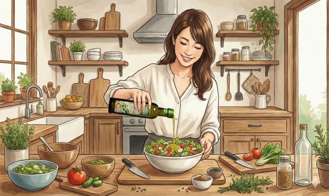 エキストラバージンオリーブオイルの香りが強すぎて料理に合わないと感じる場合、クセのないサラダ油で割ることで、マイルドで食べやすい風味に調整できます。自家製ドレッシングを作る際にも有効です。