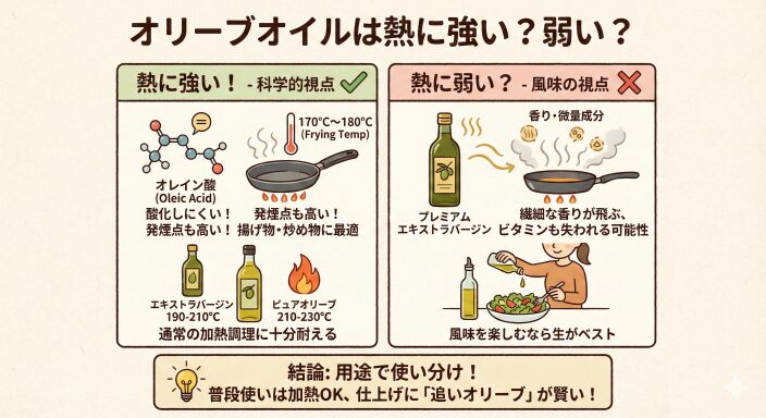 「オリーブオイルは加熱すると酸化するから、生で食べるべき」という説がまことしやかに囁かれていますが、科学的な視点から見ると、これは大きな誤解を含んでいます。結論から申し上げますと、オリーブオイルは加熱調理に非常に強く、揚げ物や炒め物に最適な油です。