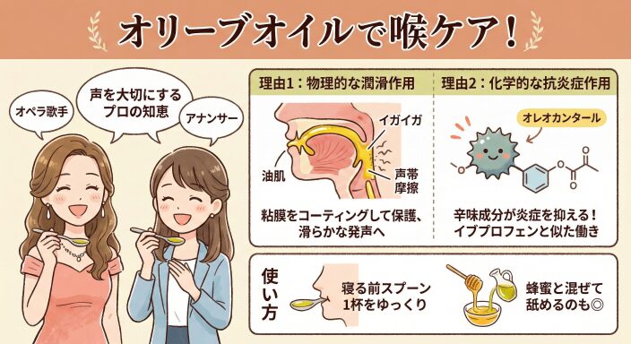 - 一つは「物理的な潤滑作用」です。オリーブオイルの粘性が、乾燥した喉の粘膜を優しくコーティングし、保護膜を作ります。これにより、乾燥によるイガイガを防ぎ、声帯の摩擦を和らげて滑らかな発声を助けます。