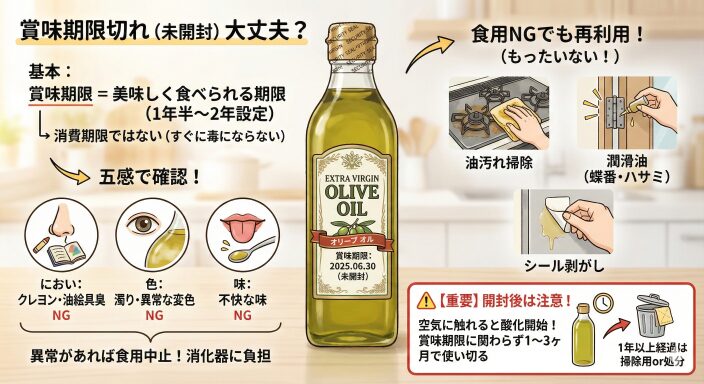 オリーブオイルの賞味期限は、一般的に未開封で1年半〜2年に設定されています。賞味期限とは「美味しく食べられる期限」のことであり、消費期限(安全に食べられる期限)とは異なります。「1日でも過ぎたら毒になる」わけではありません。直射日光の当たらない冷暗所で適切に保存されていた未開封のものであれば、期限を数ヶ月過ぎていても、風味は多少落ちているかもしれませんが、食用として使える場合が多いです。