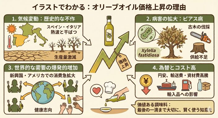 「ピアス病(Xylella fastidiosa)」という、オリーブの木を枯らす細菌による病気が地中海沿岸で猛威を振るい、多くの古木が伐採を余儀なくされました。 - 世界的な需要の爆発的増加: