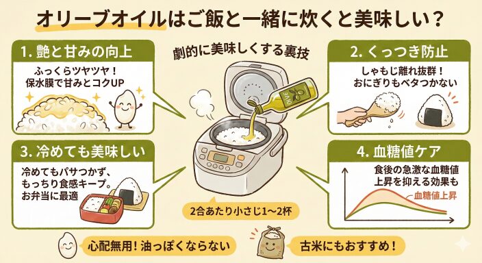 「油っぽくなるのでは?」という心配は無用です。少量であれば味や香りにクセは出ず、和食・洋食問わずどんなおかずにも合います。特に、古くなってパサつきがちな古米を美味しく食べたい時には、ぜひ試していただきたいテクニックです。