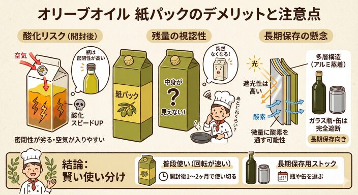- 食品コーナーに小瓶のオリーブオイルが置かれていることが多いです。量は少ないですが、これが逆にメリットになります。「酸化させる前に使い切れるサイズ」として非常に優秀なのです。