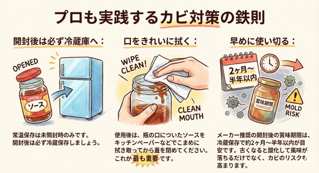 使用後は、瓶の口についたソースをキッチンペーパーなどでこまめに拭き取ってから蓋を閉めてください。これが最も重要です。 - 早めに使い切る: