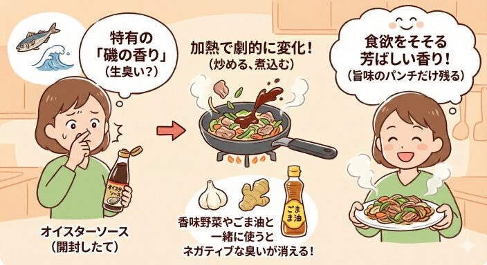 - オイスターソースには、特有の「磯の香り」があります。これは原料である牡蠣由来のものに加え、発酵や熟成の過程で生まれる独特の香りです。人によっては「干物のような匂い」「少し生臭い」と感じる場合があり、開封したての瓶から直接匂いを嗅ぐと驚くかもしれません。