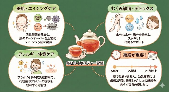 • ルイボスティーに含まれるフラボノイドの中には、アレルギー反応を引き起こすヒスタミンの放出を抑える抗炎症作用を持つものも確認されています。