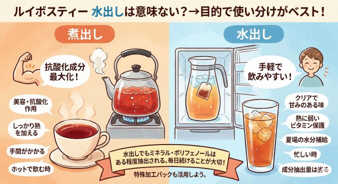 「ルイボスティーは煮出さないと成分が出ないから、水出しでは意味がない」という説を耳にしたことはありませんか?これについては、「意味がないわけではないが、目的によって使い分けるのがベスト」というのが正解です。