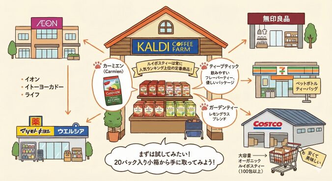はい、現在では非常に手に入りやすくなっています。特に輸入食品店の「カルディコーヒーファーム(KALDI)」では、ルイボスティーは常に人気ランキングの上位に入る定番商品であり、豊富なラインナップが揃っています。