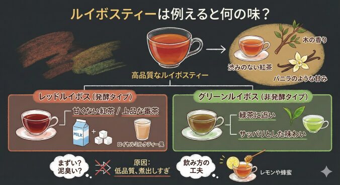 高品質なルイボスティーの味を例えるならば、「渋みのない紅茶に、ほんのり木の香りとバニラのような甘みを足したような味」です。