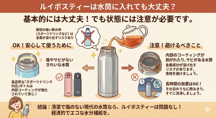 結論として、清潔で傷のない現代の水筒であれば、ルイボスティーを入れて学校や職場に持ち歩いても問題ありません。経済的でエコな水分補給として、ぜひ活用してください。