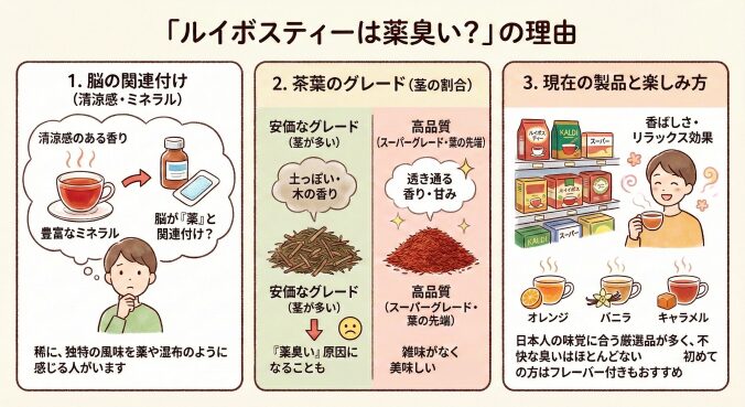 • 「薬のような匂いがする」「湿布のような匂いがする」という感想を持たれる方も稀にいらっしゃいます。これは、ルイボスティーが持つ清涼感のある香り成分や、ミネラル分が豊富なことに由来する独特の風味を、脳が「薬」と関連付けてしまうためと考えられます。