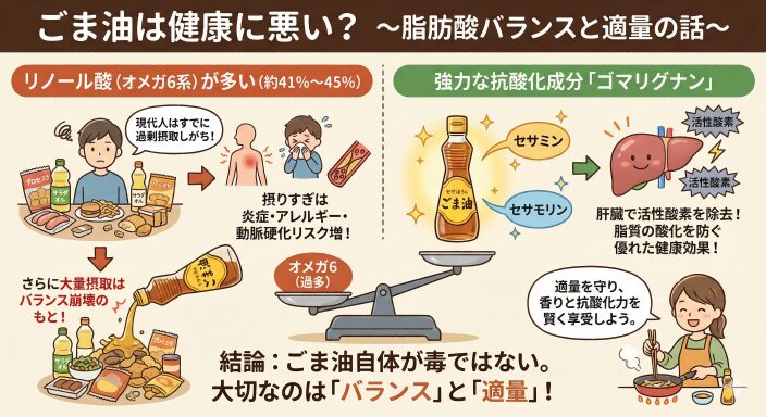 「ごま油はリノール酸が多いから体に悪い」という説を耳にしたことがあるかもしれません。これは、栄養学の「脂肪酸バランス」の議論から来ています。