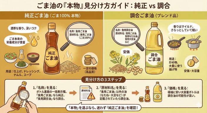 ボトルの裏面にある一括表示欄の「名称」を見てください。「食用ごま油」とあればごま100%の純正品です。「食用調合油」とあればブレンド品です。 - 「原材料名」を見る:
