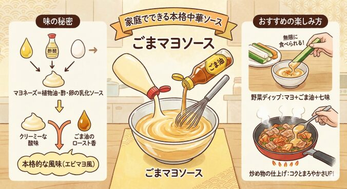 マヨネーズとごま油を混ぜると、一瞬で「家庭でできる本格中華ソース」が完成します。