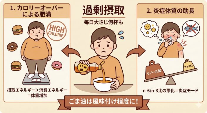 ごま油を日常的に過剰摂取(例えば毎日大さじ何杯も飲むなど)した場合、以下の2つのリスクが考えられます。