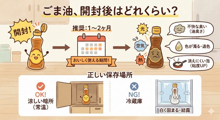「ごま油は酸化しにくい」と言われますが、それでも永遠にもつわけではありません。開封した瞬間から、光、空気、熱による劣化(酸化)のカウントダウンは始まっています。