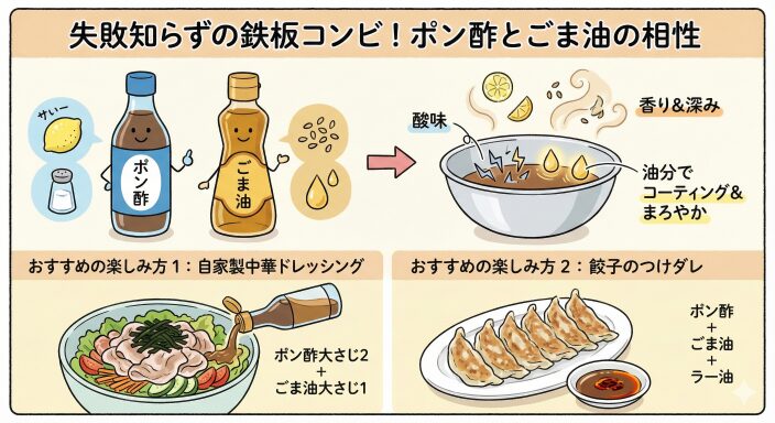 - ポン酢には酢の「酸味」と醤油の「塩味」がありますが、酸味が尖って感じられることがあります。ここにごま油を加えると、油分が酸味をコーティングしてカドを取り、まろやかな味わいに変化させます(乳化に近い効果)。