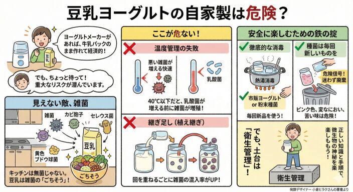 家庭のキッチンは、どんなに掃除をしていても無菌ではありません。空気中には常に目に見えない雑菌やカビの胞子が漂っています。豆乳は栄養価が非常に高いため、乳酸菌だけでなく、食中毒を引き起こすような雑菌(セレウス菌や黄色ブドウ球菌など)にとっても、格好の「ごちそう」なのです。