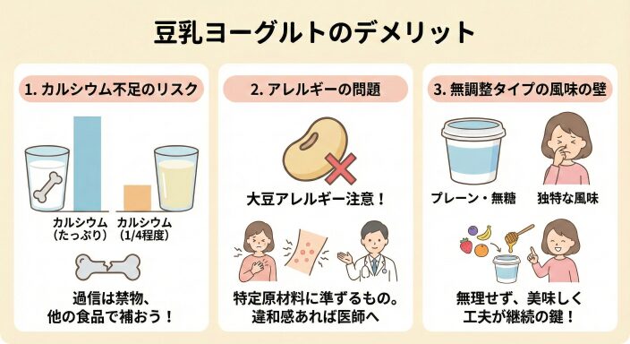 どんなに優れた食品にも、光と影があります。豆乳ヨーグルトを生活に取り入れる上で、知っておくべき注意点もしっかりとお伝えします。