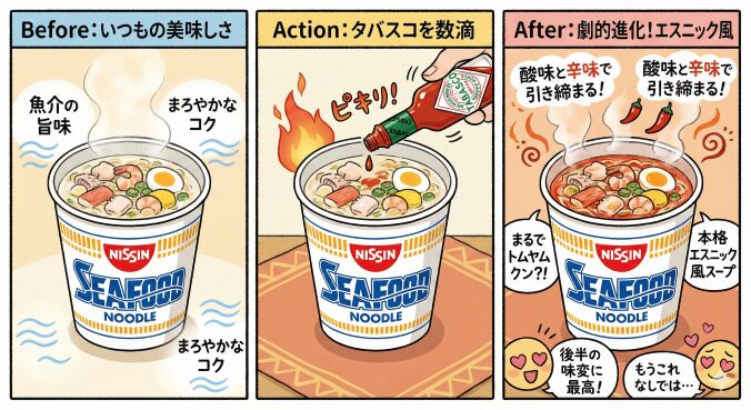 • シーフードヌードルのスープは、魚介の旨味とまろやかなコクが魅力ですが、そこにタバスコを数滴垂らすことで、驚くほど本格的なエスニック風スープへと進化します。