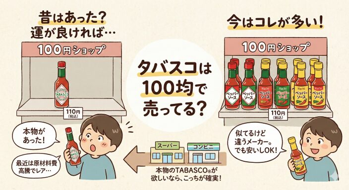 • 「タバスコを100均で買いたい」という需要は多いですが、現状ではダイソーやセリアなどの大手100円ショップでの取り扱いは店舗によって様々です。