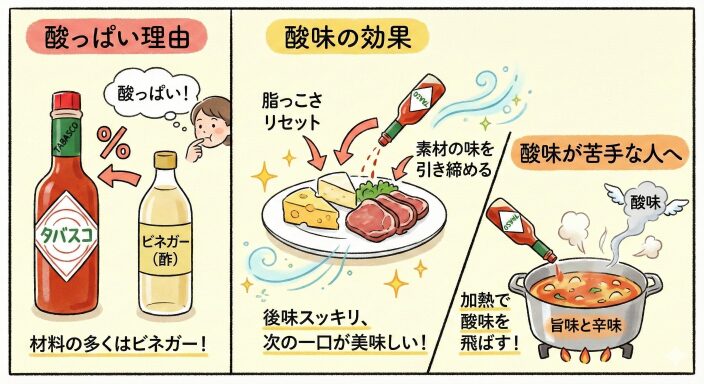 • タバスコを一口食べて「酸っぱい!」と感じる方が多いのは、当然のことかもしれません。なぜなら、タバスコの材料の大きな割合を占めているのが「ビネガー(酢)」だからです。