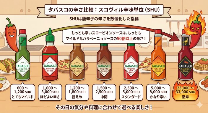 「スコヴィル辛味単位(SHU)」は、唐辛子の辛さを数値化した指標です。タバスコシリーズのスコヴィル値を比較すると、その多様性がよく分かります。