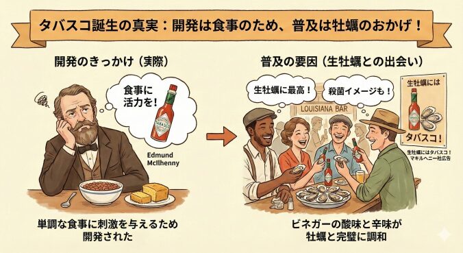 • 「タバスコは生牡蠣を安全に食べるために開発された」という説が広く流布していますが、これは歴史的に見ると「正確なきっかけではないが、普及の大きな要因だった」と言えます。