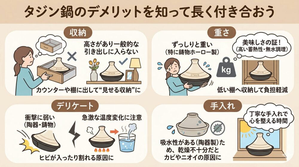 お気に入りの道具と長く付き合うためには、その「弱点」も知っておきたいものです。タジン鍋を検討する際に、多くの方が直面するデメリットと、それを前向きに解決するヒントを整理しました。
