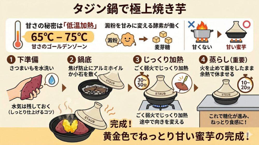 さつまいもが甘くなるのには、科学的な理由があります。さつまいもに含まれる澱粉が「β-アミラーゼ」という酵素の働きによって麦芽糖(甘み成分)に変わるのですが、この酵素が最も活発に働くのが65℃から75℃という比較的低い温度帯なのです。強火で一気に加熱してしまうと、この温度帯をすぐに通り過ぎてしまい、甘みが十分に引き出されません。
