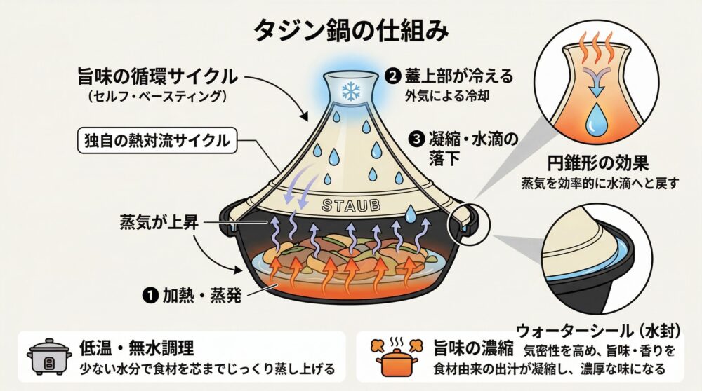 タジン鍋が「魔法の鍋」と呼ばれる最大の理由は、その高い蓋が作り出す独自の熱対流サイクルにあります。これを物理学的な視点で見ると、非常に効率的な「蒸留・循環システム」であると言えます。