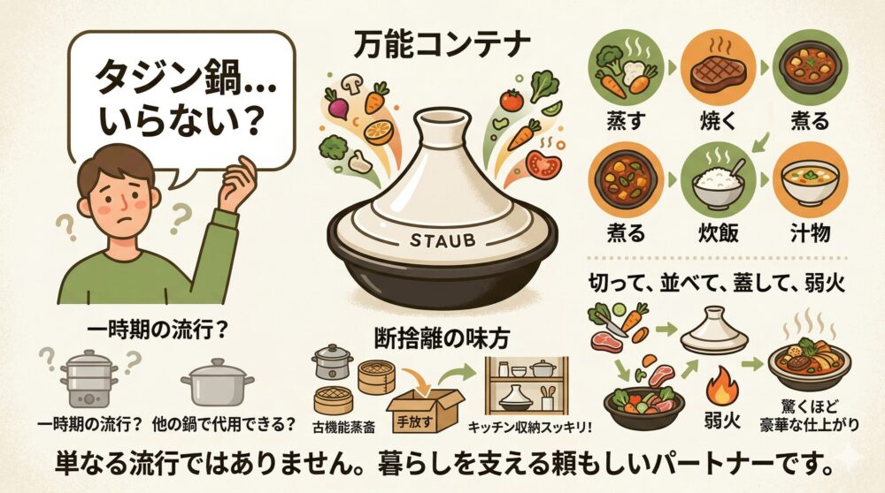 「一時期流行ったけれど、結局使わなくなるのでは?」「他の鍋で代用できるから、いらないのではないか」。そんな風に思われる方もいらっしゃるかもしれませんね。確かに、キッチンは限られたスペースですから、新しい道具を増やすことには慎重になるのが当然です。しかし、タジン鍋を「単なる流行の蒸し器」として捉えるのは、少しもったいないかもしれません。