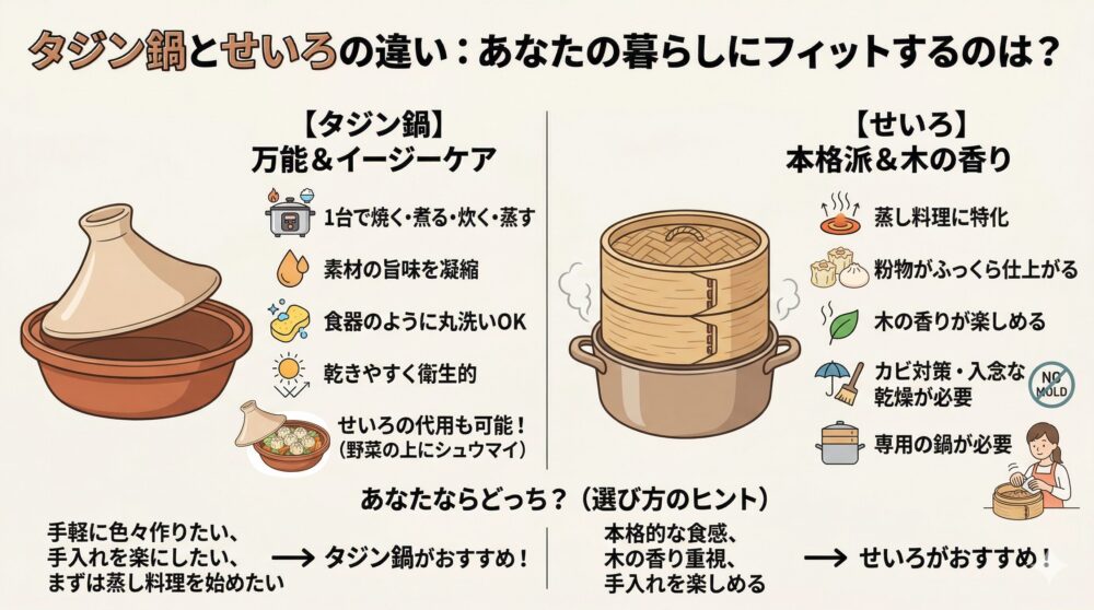 あるユーザーさんは、以前は両方持っていましたが、せいろの管理(カビ対策やサイズの合う鍋探し)に疲れ、最終的にタジン鍋一つに絞ったそうです。タジン鍋なら、野菜の上にシュウマイを置いて蒸すことで、せいろのような使い方も代用できますし、そのままお肉を焼いたり、スープを作ったりすることも可能です。