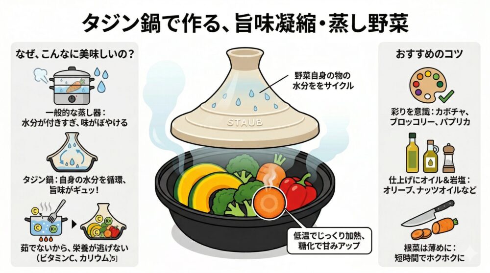 通常の蒸し器や電子レンジでの加熱と大きく違う点は、野菜の旨味が「希釈されない」ということにあります。一般的な蒸し器は、外部から供給された多量の水蒸気で加熱するため、どうしても野菜の表面に水分が付きすぎてしまい、味がぼやけてしまいがちです。しかし、タジン鍋は野菜自身の水分を循環させるため、旨味や甘みがギュッと凝縮され、驚くほど濃厚な味わいになります。