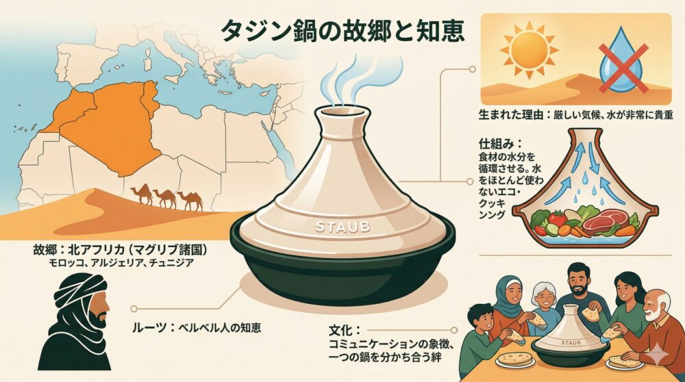 タジン鍋の故郷は、北アフリカの北西部に位置するマグリブ諸国、主にモロッコ、アルジェリア、チュニジアといった地域です。そのルーツは、この地に古くから暮らす先住民族「ベルベル人」の知恵にまで遡ります。
