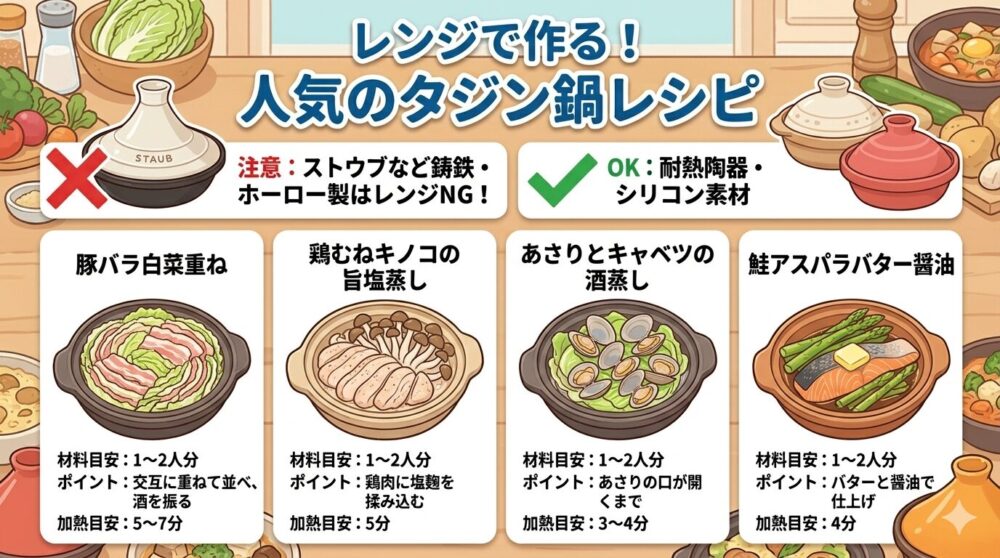 いかがでしょうか。どのレシピも、材料を切ってタジン鍋に並べるまでの時間はわずか数分です。あとはレンジにお任せしている間に、もう一品作ったり、少し一息ついたりすることもできますね。