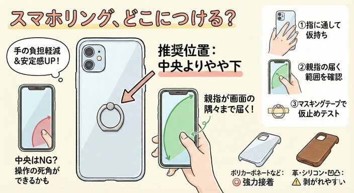 • スマホリングを装着する際、多くのユーザーが「背面の真ん中」という直感的な選択をしがちです。しかし、実はこの「位置」こそが、使い勝手の8割を決めると言っても過言ではありません。