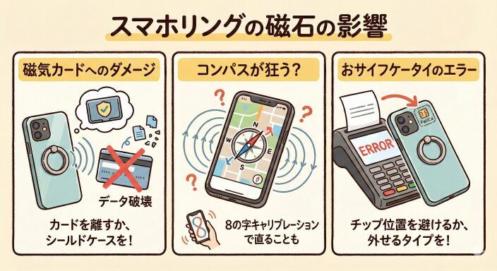 • おサイフケータイ(FeliCa)については、磁石そのものがチップを破壊することは稀ですが、リングの金属素材や磁力がリーダーとの通信を物理的に遮断し、「決済エラー」を引き起こす原因になることがあります 。これを防ぐには、ICチップの搭載位置(多くは背面カメラの横や中央部)を把握し、そこをリングが覆わないように配置するか、決済時のみリングを取り外せるMagSafeタイプを選択するのが非常に賢明な判断です。