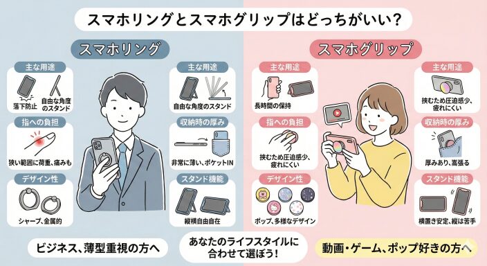 スマホリングは、ビジネスシーンでも違和感のない洗練された外観と、薄型であることの利便性を重視する方に適しています。一方、スマホグリップは、動画視聴やゲームを長時間楽しむ方や、韓国風のポップなデザインを好む若年層から絶大な支持を得ています 。あなたの「指」が何を求めているのか、一度じっくりと耳を傾けてみてはいかがでしょうか。