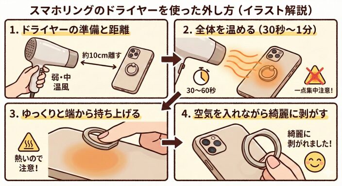 お気に入りのケースに強力に貼り付いたスマホリング。デザインに飽きた時や、ケースを買い替える際、「どうやって綺麗に剥がせばいいのだろう」と不安になることもあるでしょう。そんな時に頼りになるのが、ご家庭にあるドライヤーです。